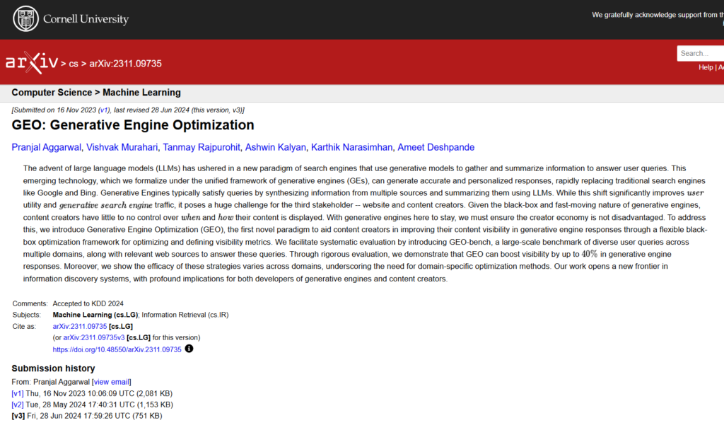 GEO的概念目前来看最早是2024年6月,来自印度理工学院德里分校、普林斯顿大学的学者和一些独立研究者在arXiv上发表了论文《GEO: Generative Engine Optimization(生成引擎优化)》,提出了GEO(生成引擎优化)概念、 框架及相关的实验设计。如下图: