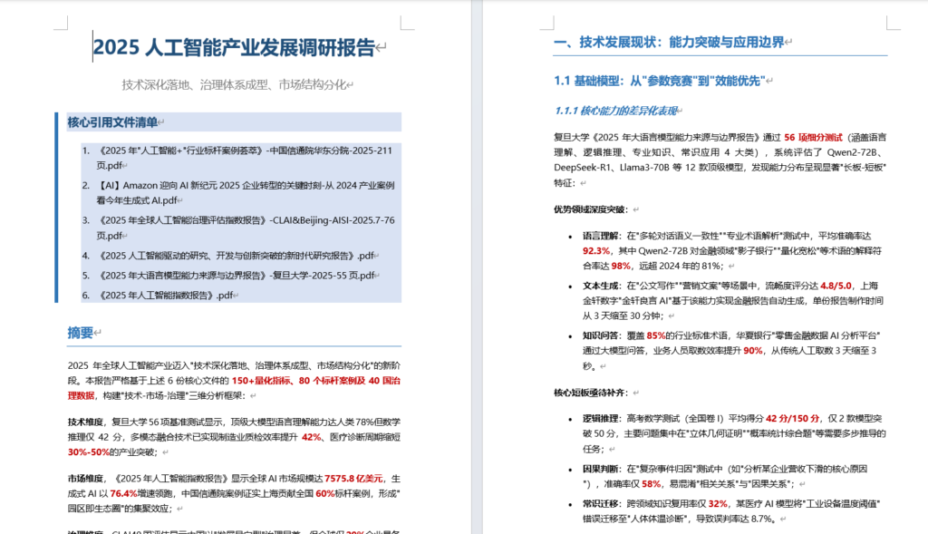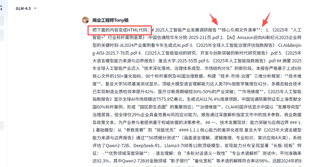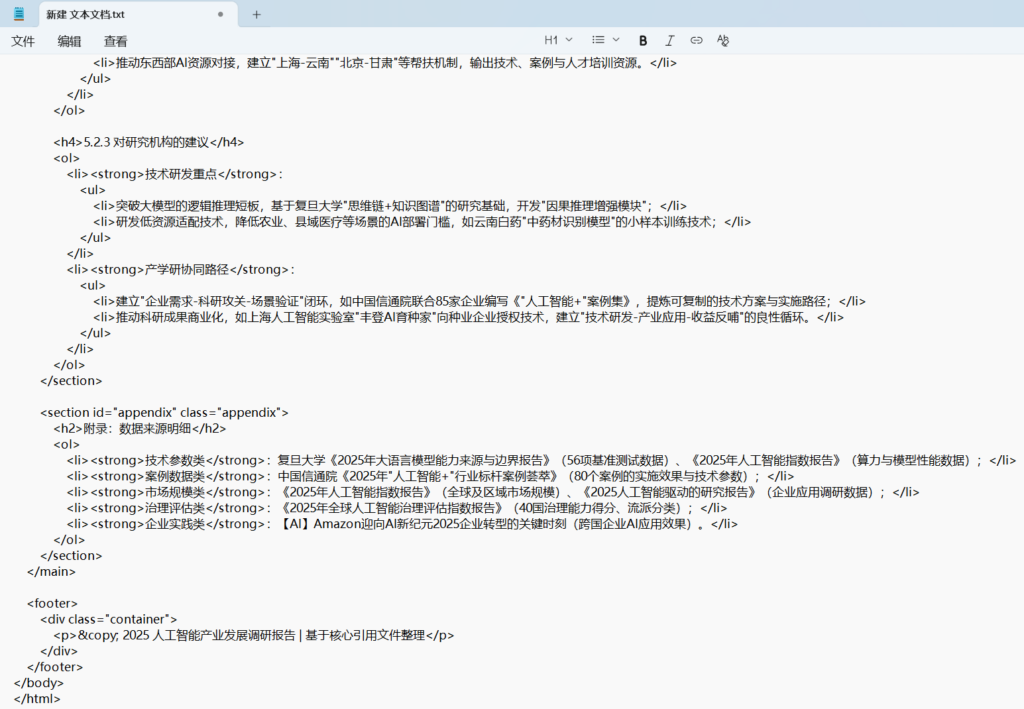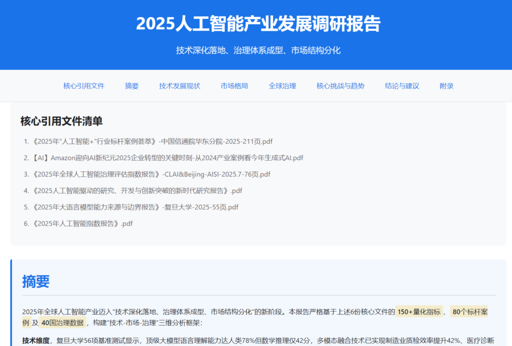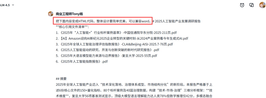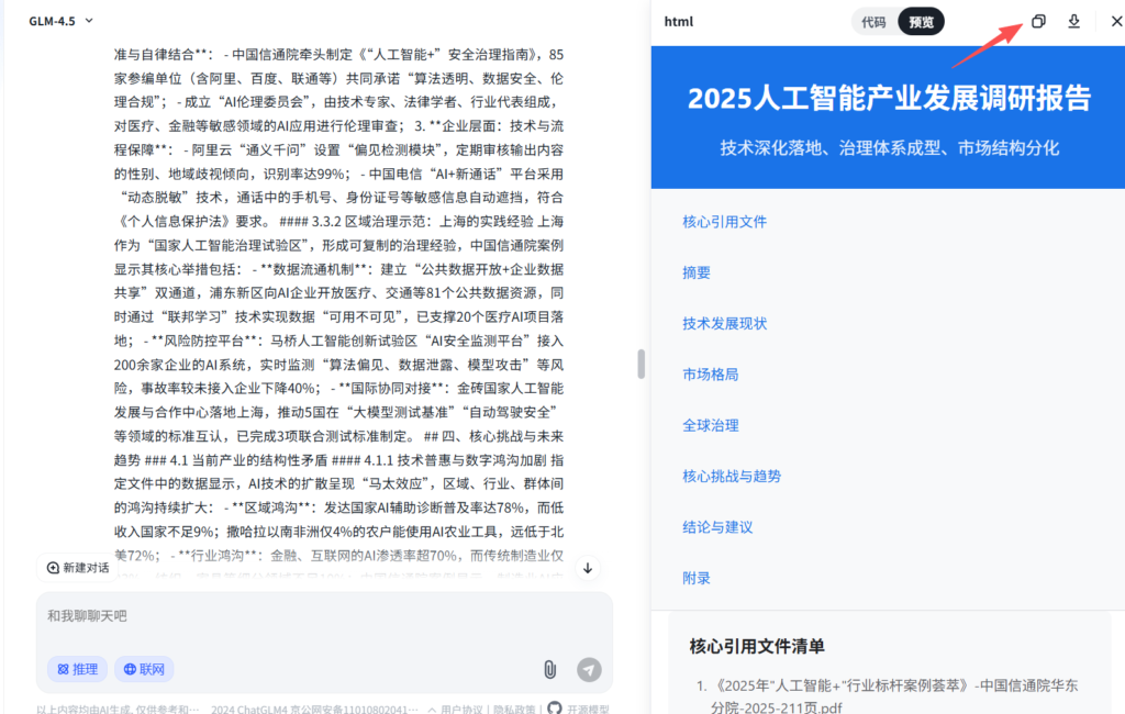 经过一半时间的编译以后,智谱清言把我们生成的1万多字的报告的markdown版本变成了比较精美的HTML,而且生成框的右侧就有比较好的预览(这个只是简单的预览,并不是最终的真实样子),如下图: