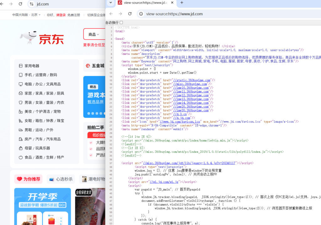 这时候就要用AI进行排版了,用AI排版之前,我们要先知道一下HTML代码,HTML代码是网页的源文件,也就是说我们人眼看到的丰富多彩的网页,底层是由HTML+CSS+JS进行管理控制并展示的,比如京东的HTML代码如下图,左侧是人眼看到的,右侧是程序看到的: